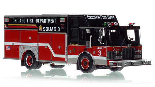 This Chicago Squad 3 scale model is a museum grade replica of the 1996 HME/Saulsbury Squad. Like all Fire Replicas models, every detail is modeled to perfection and with razor sharp precision. The replica features the specific department configuration and graphics, leaving no detail overlooked. The display case is custom manufactured with high quality acrylic and resin. The stainless steel etched plate features the department and truck name, and department seal. This replica is a treasure to be displayed and admired and is in no way a toy.