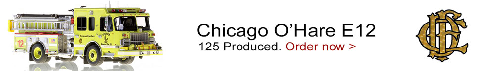 The newest addition to the Chicago O'Hare replica program is Engine 12, a 2011 Spartan Gladiator/Crimson. Like all Fire Replicas models, Engine 12 is a hand-crafted, museum grade replica with over 445 parts and a fully custom display case. Production has been limited to 125 units. CFD Engine 12 is a follow up to the sold out Rosenbauer Squads 7/7A, released in 2017.